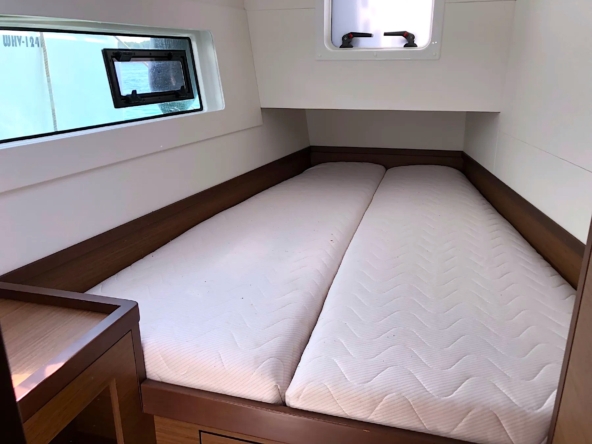 The aft cabin, equipped with a semi-island berth and ample storage, offers abundant natural light and spectacular views.